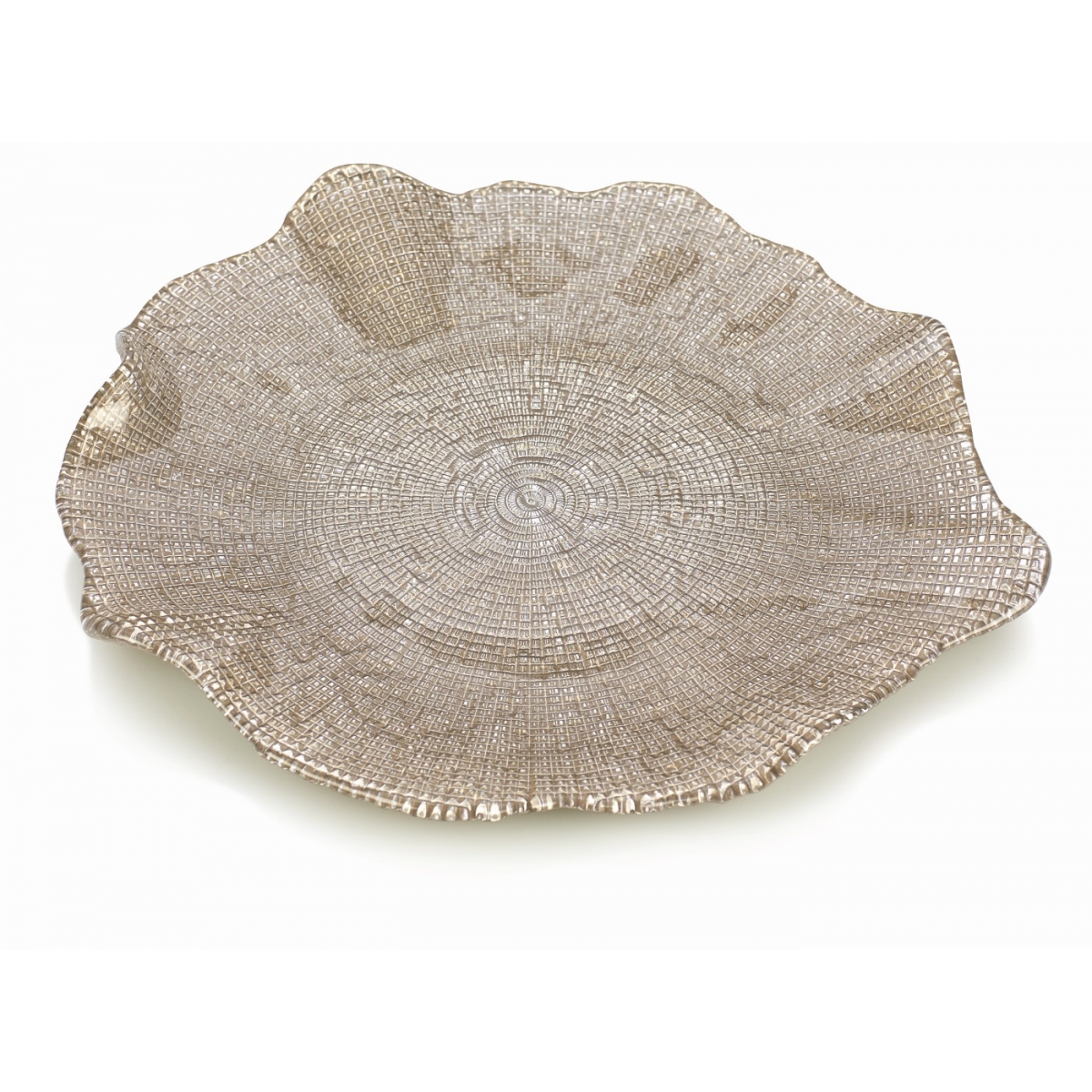 Duża patera z kolekcji Folies wykonana z przezroczystego szkła prasowanego. Jej zewnętrzna powierzchnia zdobiona jest nieregularnym wzorem, który tworzy efektowną grę światła i faktury – błyszczącą, a zarazem przyjemną w dotyku. Idealna zarówno do serwowania, jak i jako dekoracyjny akcent na stole lub komodzie.
