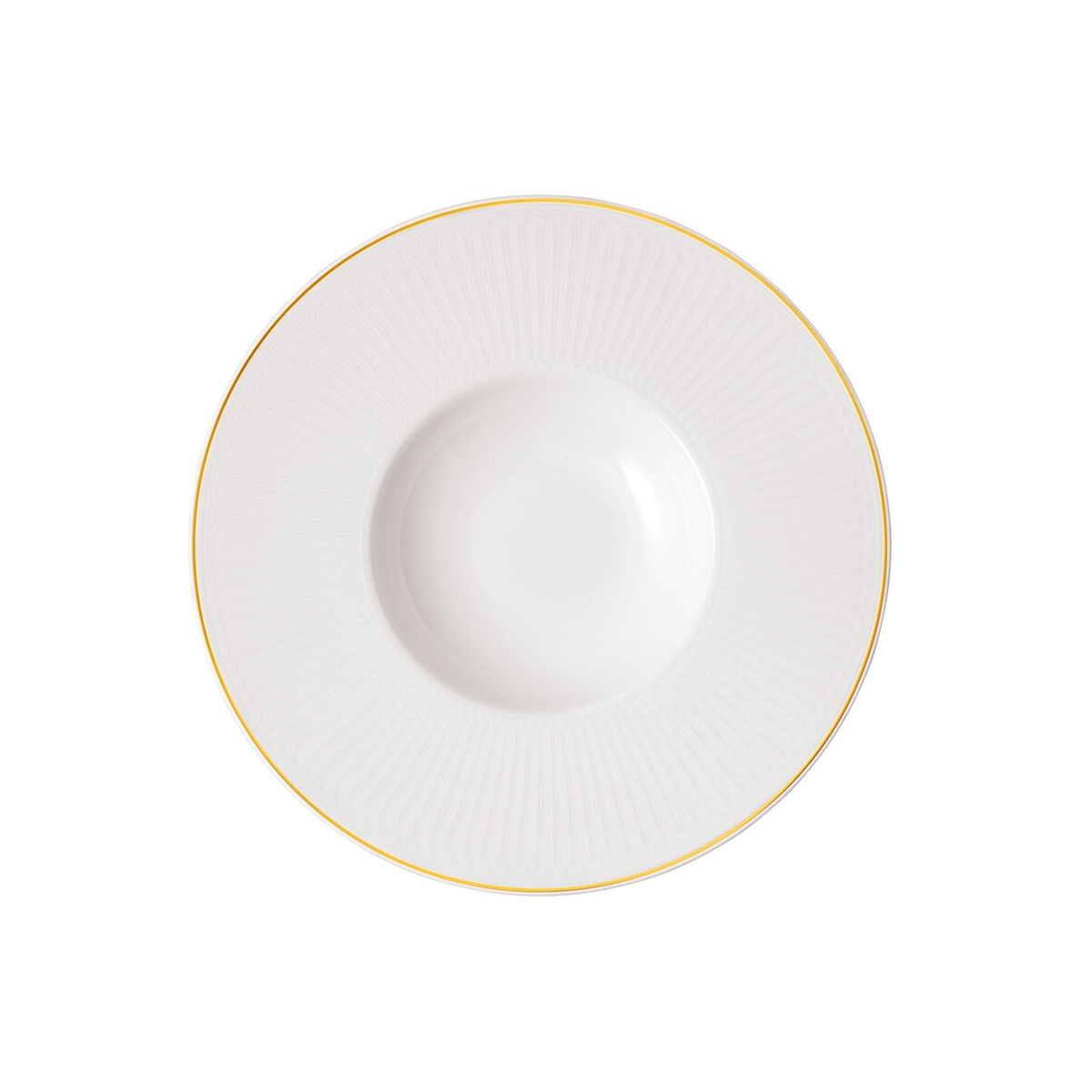Talerz głęboki z kolekcji Château Septfontaines od Villeroy & Boch. Château Septfontaines to prestiżowa kolekcja odnosząca swoją nazwę od zamku Château de Septfontaines w Luksemburgu. Wzory nawiązują do stylu barokowego i klasycystycznego, dodając kolekcji romantyzmu i elegancji. Charakterystyczny relief z błyszczącej porcelany tworzy ponadczasową elegancję, a delikatne wykończenie 20-karatowym złotem dodaje luksusu. Łączy w sobie tradycję i nowoczesność, idealna na specjalne okazje i jako prezent dla miłośników eleganckich wyrobów stołowych.