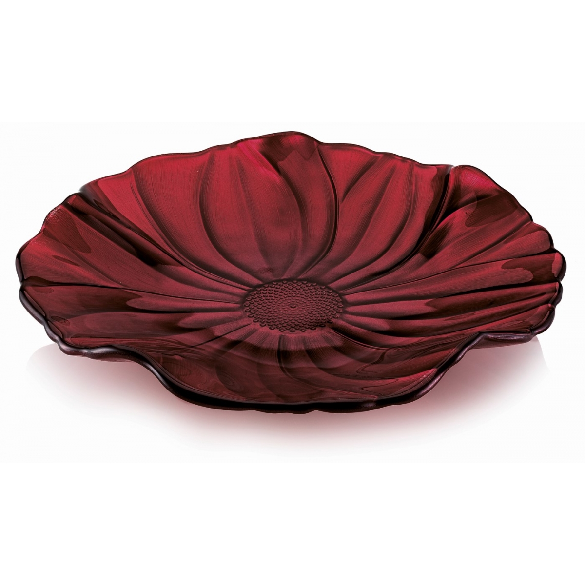 Elegancki talerz ze szkła prasowanego z kolekcji Magnolia zachwyca kształtem inspirowanym kwiatem magnolii i bordową, perłową dekoracją.
