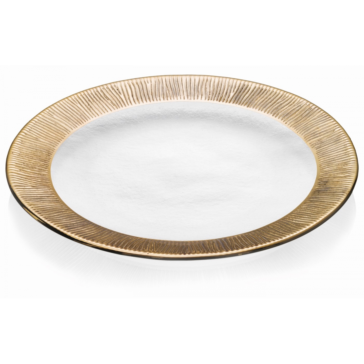 Talerz obiadowy z kolekcji Dinner in Jeddah to połączenie funkcjonalności i subtelnej elegancji. Wykonany z transparentnego, prasowanego szkła, wyróżnia się prostą formą i dekoracyjnym złotym paskiem biegnącym wzdłuż zewnętrznej krawędzi.