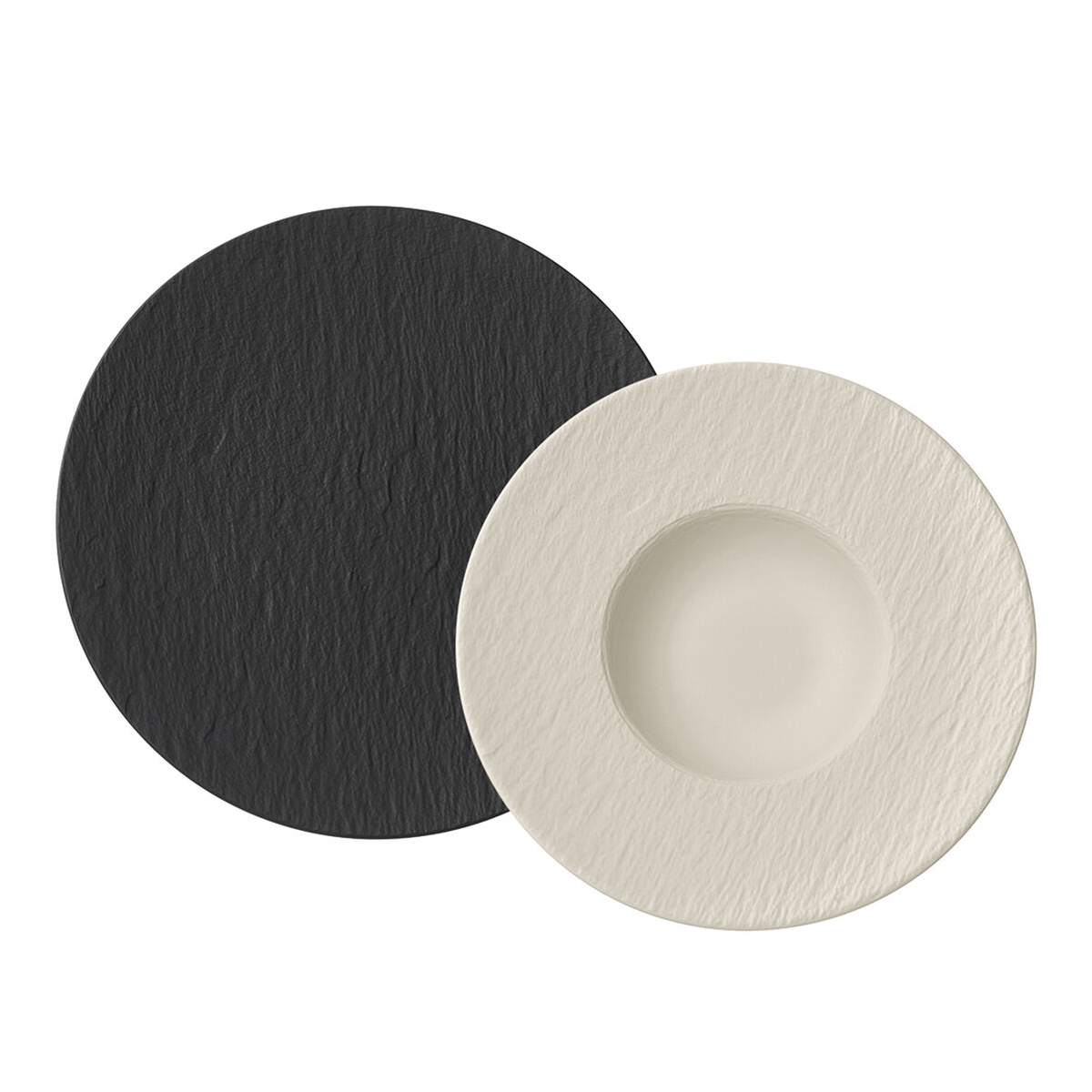 Zestaw do makaronu: 2 talerze gourmet czarne i 2 talerze do makaronu białe. Manufacture Rock od Villeroy & Boch stworzy niepowtarzalną atmosferę w Twojej kuchni. Kolekcja Manufacture Rock jest naturalna, pierwotna i wyjątkowa w dotyku. Rzemieślniczy styl matowej strukturalnej porcelany przypominającej łupek wyróżnia tę kolekcję spośród innych i tworzy w efekcie ciepłą atmosferę przy stole.