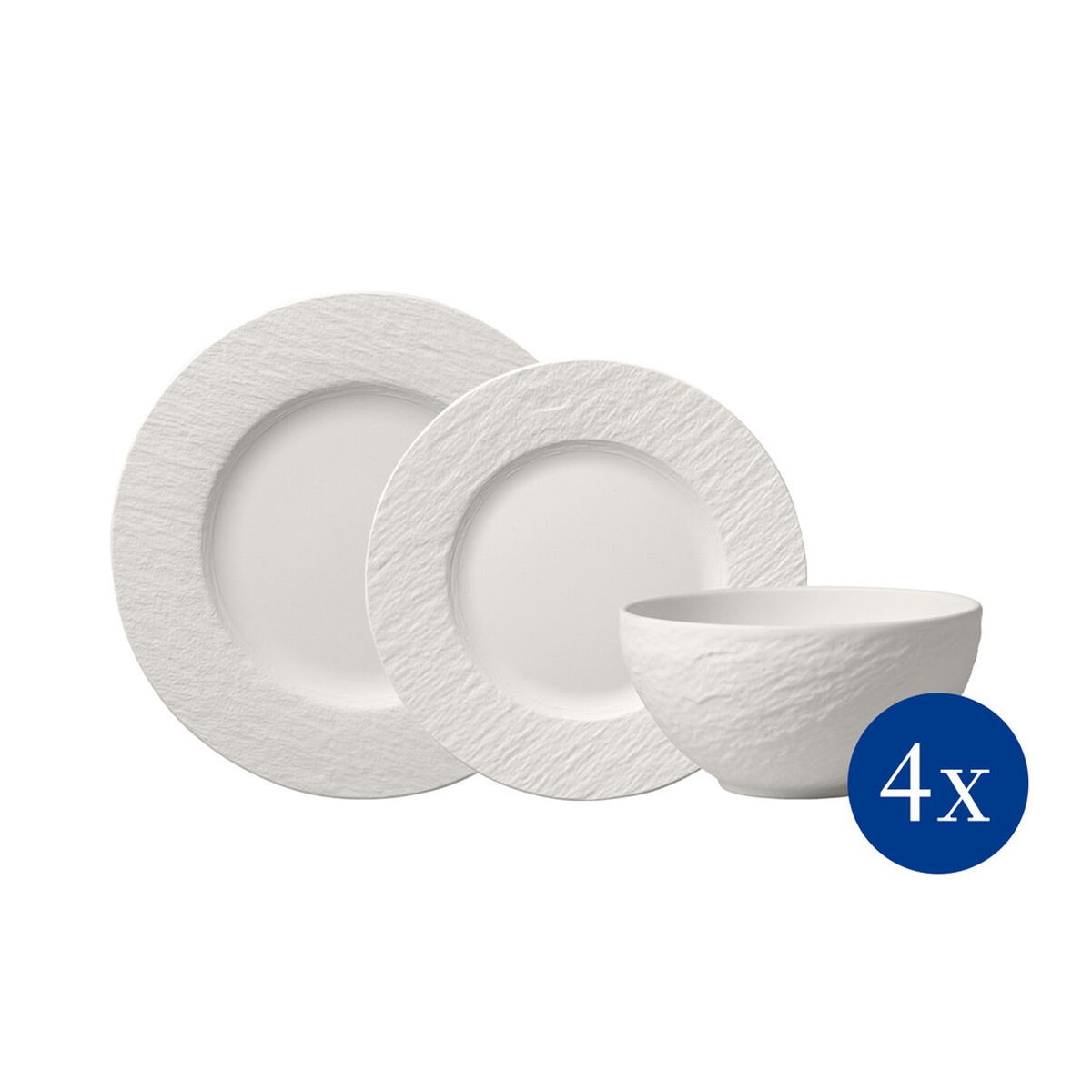 Zestaw dla 4 osób. Manufacture Rock Blanc od Villeroy & Boch stworzy niepowtarzalną atmosferę w Twojej kuchni. Kolekcja Manufacture Rock jest naturalna, pierwotna i wyjątkowa w dotyku. Rzemieślniczy styl matowej strukturalnej porcelany przypominającej łupek wyróżnia tę kolekcję spośród innych i tworzy w efekcie ciepłą atmosferę przy stole.