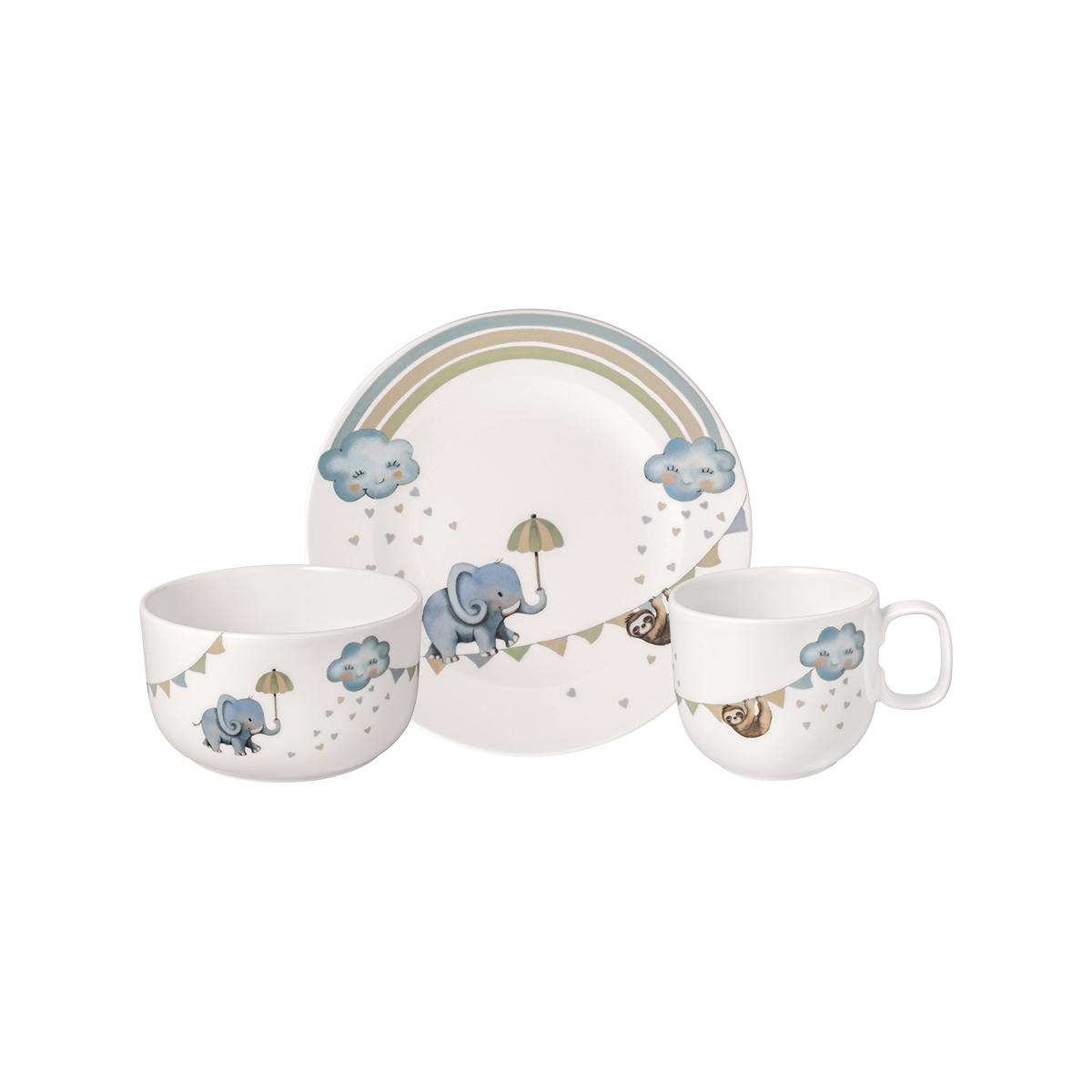 Zestaw naczyń dziecięcych: talerz płaski, miseczka i kubek z kolekcji Walk like an Elephant od Villeroy & Boch. Seria dziecięcych naczyń z porcelany ozdobionych uroczym słoniem.