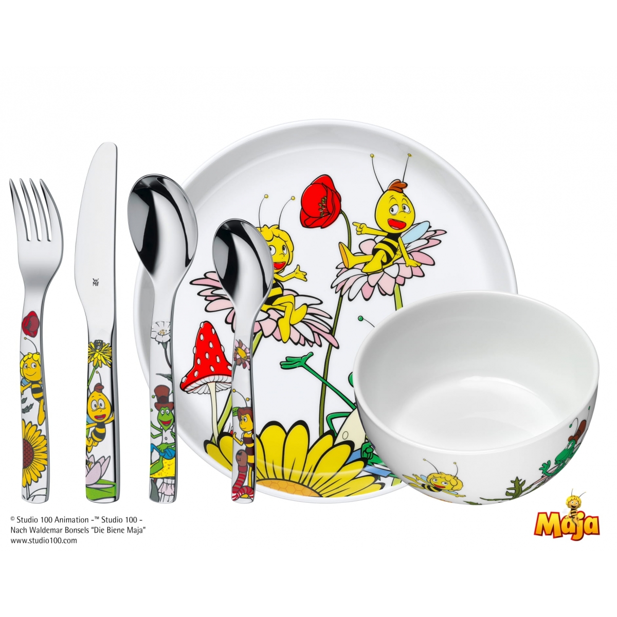 Miseczka i talerz oraz widelec, nóż, łyżka i łyżeczka z motywem bajki Pszczółka Maja marki WMF. Miska i talerzyk są wykonane z porcelany. Nóż w zestawie jest na swój sposób tępy, aby dziecko nie mogło w jakiś sposób się skaleczyć. Łyżeczka ma owalne krawędzie a w dodatku są krótkie co przekłada się na zakres ruchliwości oraz na bezpieczeństwo. Natomiast widelec w zestawie posiada tępe ząbki, które są idealnie wymierzone by mieściły się w małych buźkach.