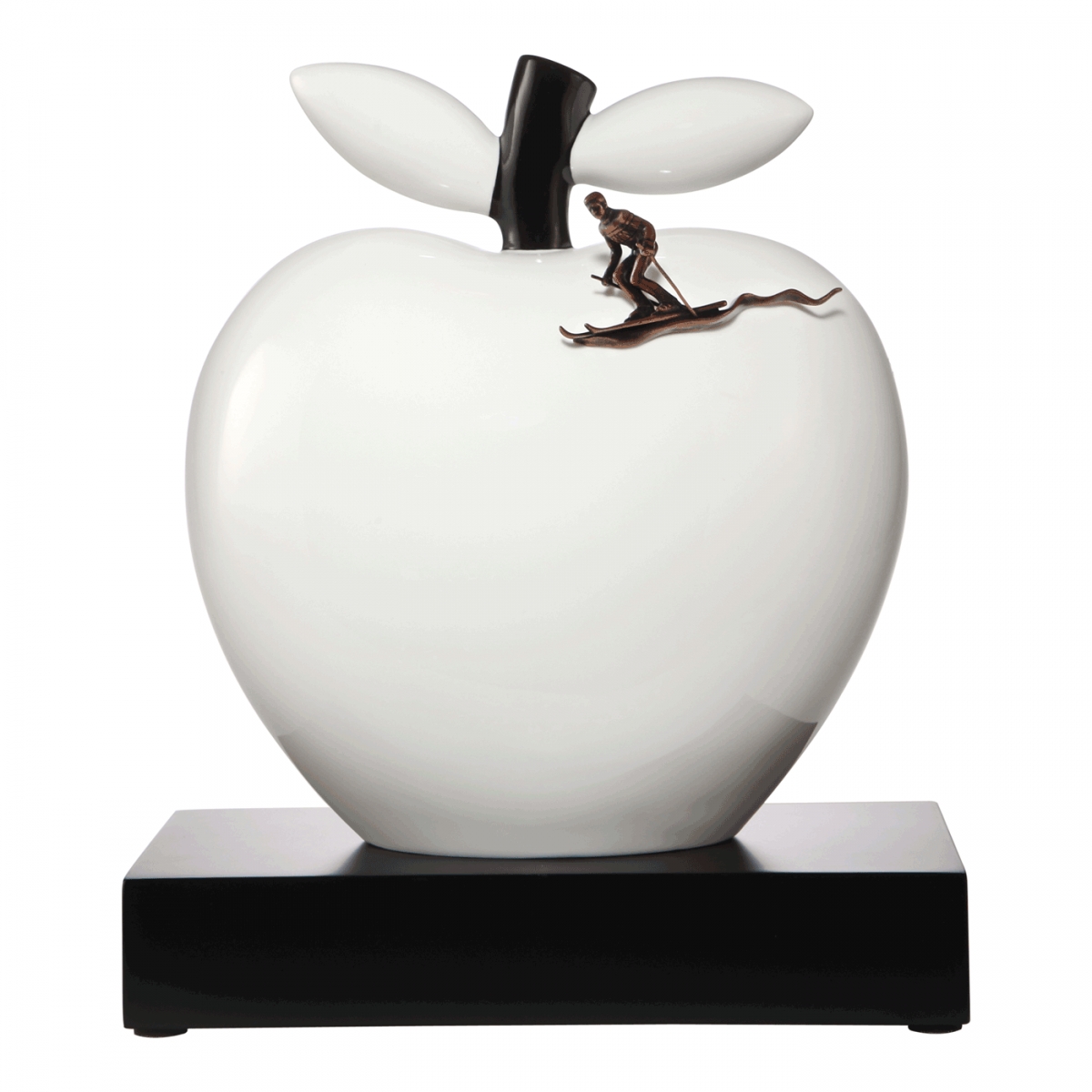 Figurka Jabłko - Przygoda i wolność z kolekcji Studio 8 od Goebel. Ekscytujący świat designu Studio 8. Jabłko jako porcelanowa figurka na eleganckiej drewnianej podstawce z dekoracją narciarza z mosiądzu. Sztuka i jabłko - jabłko jest jednym z najpopularniejszych owoców i oznacza nadzieję i zdrowie, pragnienie i miłość, zakaz, strach i witalność.
