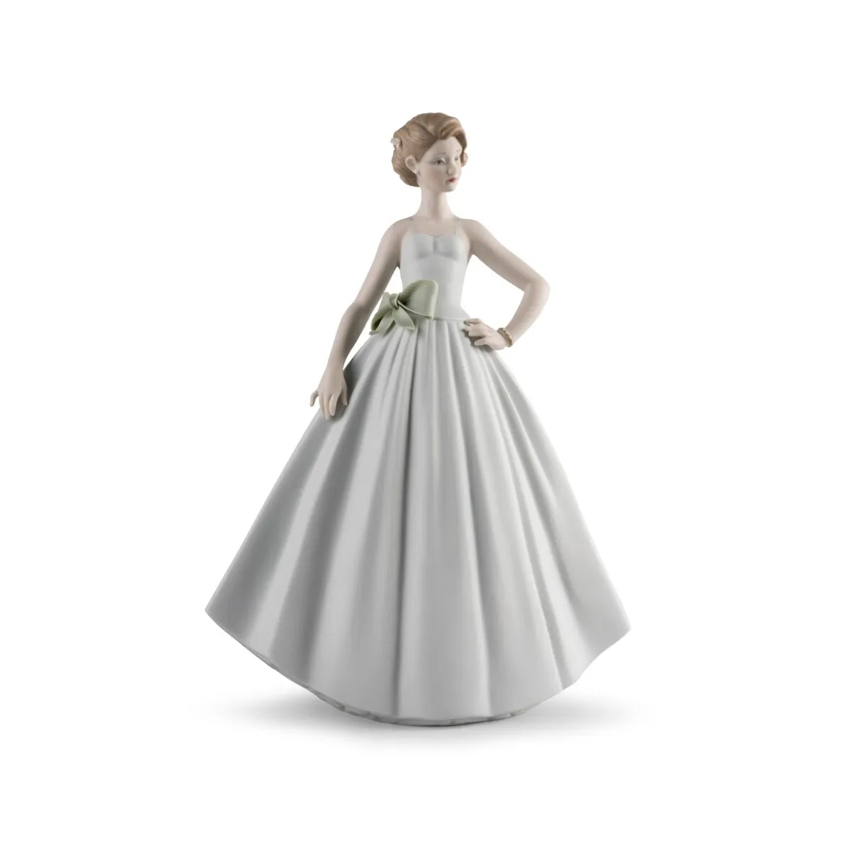 Figurka z porcelany - Moja ulubiona suknia. Piękna młoda kobieta ubrana w wieczorową suknię do wyjścia na galę. Subtelna harmonia koloru i formy na matowej porcelanowej bazie. Piękna dekoracja od Lladro.