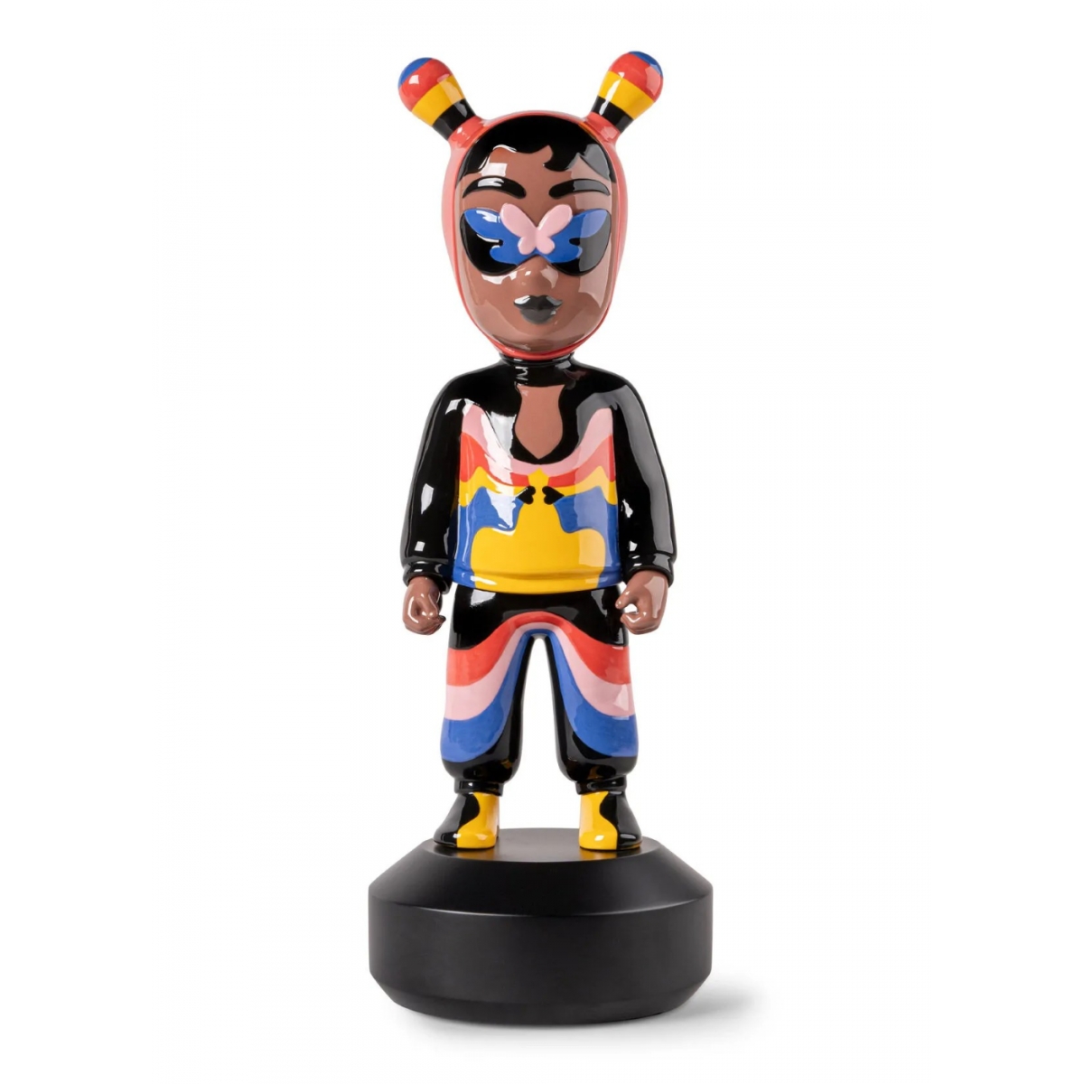 Figurka Gość - niespodziewany, urzekający, wyjątkowy... Gość to projekt Lladró Atelier, który zaprasza znanych artystów do nadania oryginalnego charakteru tej porcelanowej postaci. Postać z trzema dużymi oczami na twarzy, które „pozwalają mu widzieć przeszłość, teraźniejszość i przyszłość, jakby był posłańcem podróżującym w czasie”, odcienie niebieskiego na białej porcelanie, połączone z akcentami złotego połysku, aby oddać wrażenie prestiżu, tak blisko związanego ze starożytną chińską porcelaną.