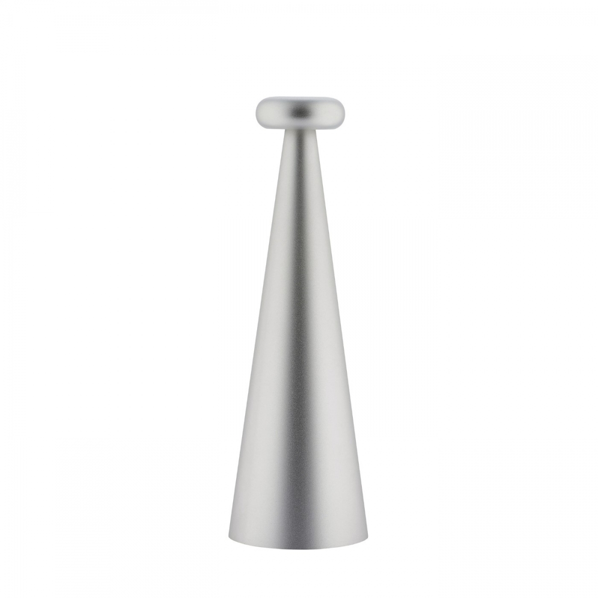 Nowoczesna, akumulatorowa lampa LED z anodowanego aluminium i antypoślizgową silikonową podstawą.
