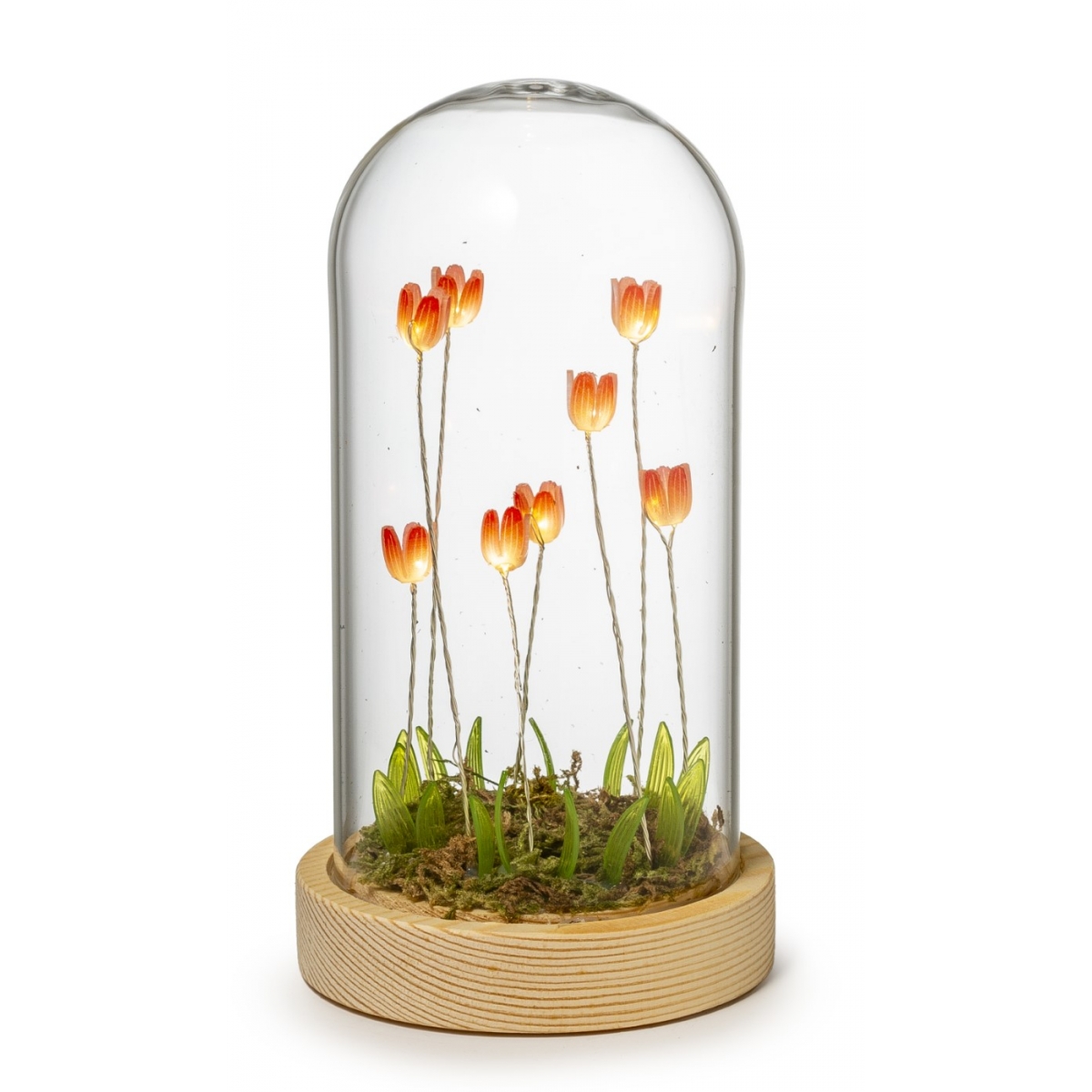 Szklana lampa kopuła z drewnianą podstawą i ledowymi kwiatami – Palais Royal.