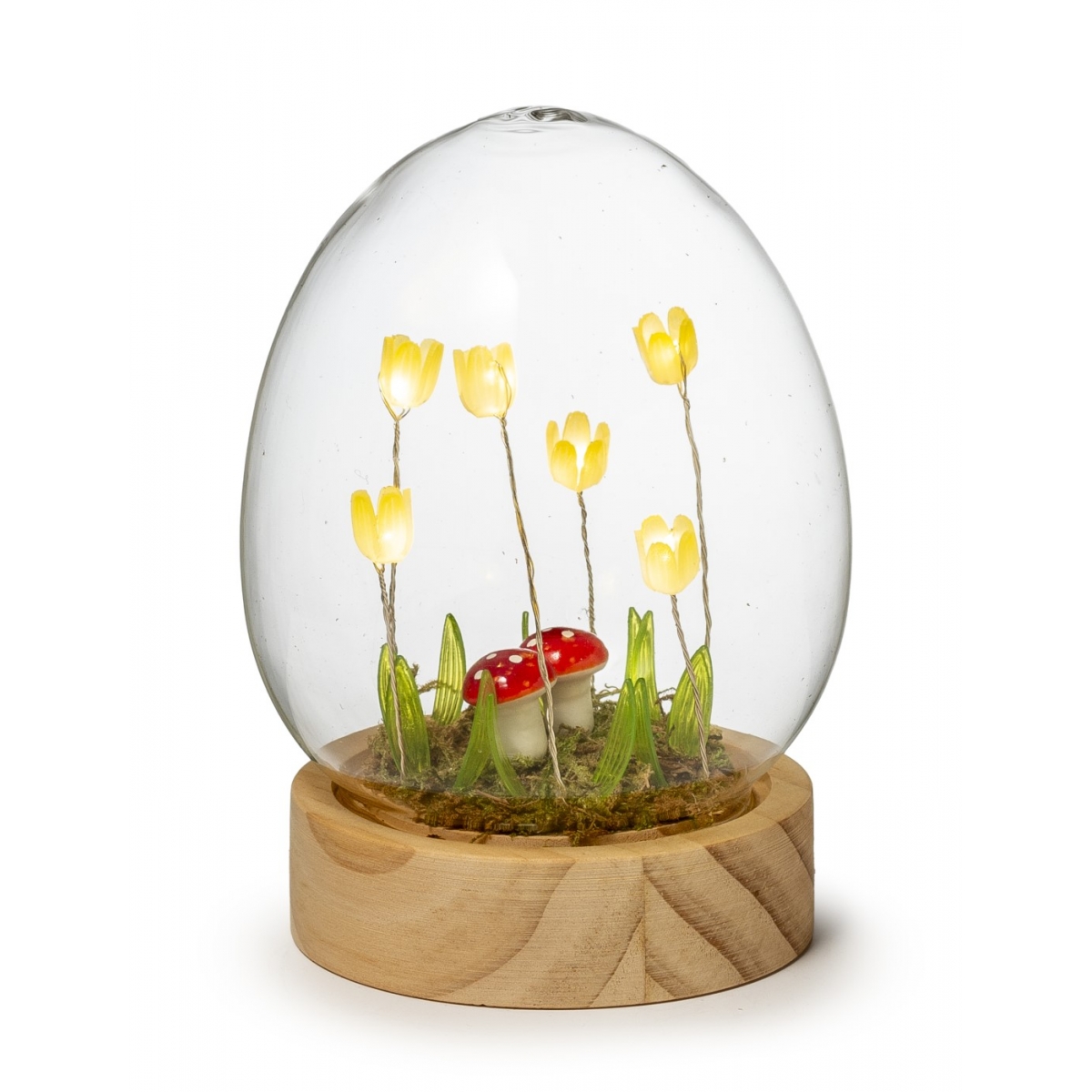 Szklana lampa w kształcie jaja z drewnianą podstawą i ledowymi kwiatami – Palais Royal.