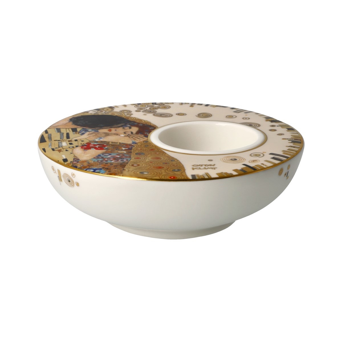 Świecznik z porcelany z kolekcji firmy Goebel. Reprodukcja obrazu Pocałunek - Gustawa Klimta. Świecznik zapakowany jest z atrakcyjne pudełko, idealne na prezent.