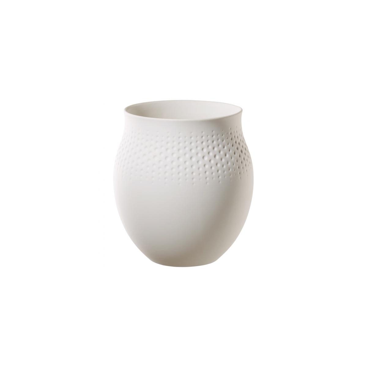 Duży porcelanowy wazon Perle w modnym kolorze o ciekawej strukturze z serii Collier blanc. Piękna dekoracja od Villeroy & Boch. W kolekcji znajdują się wazony w różnych rozmiarach i można je ciekawie ze sobą łączyć, uzyskując fantastyczny efekt i harmonijne ozdobne akcenty w domu. Bukiety letnich i wiosennych kwiatów w tym wazonie wyglądają wyjątkowo pięknie w salonie.