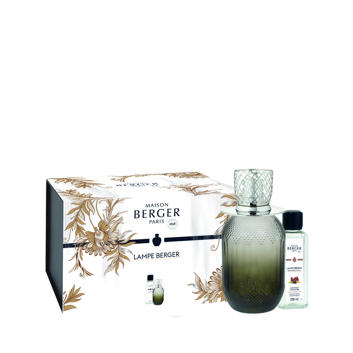 Zestaw Evanescence szaro-zielony marki Maison Berger Paris. Lampa szklana katalityczna z dyfuzorem + olejek zapachowy" Zmysłowy zamsz"(250 ml).